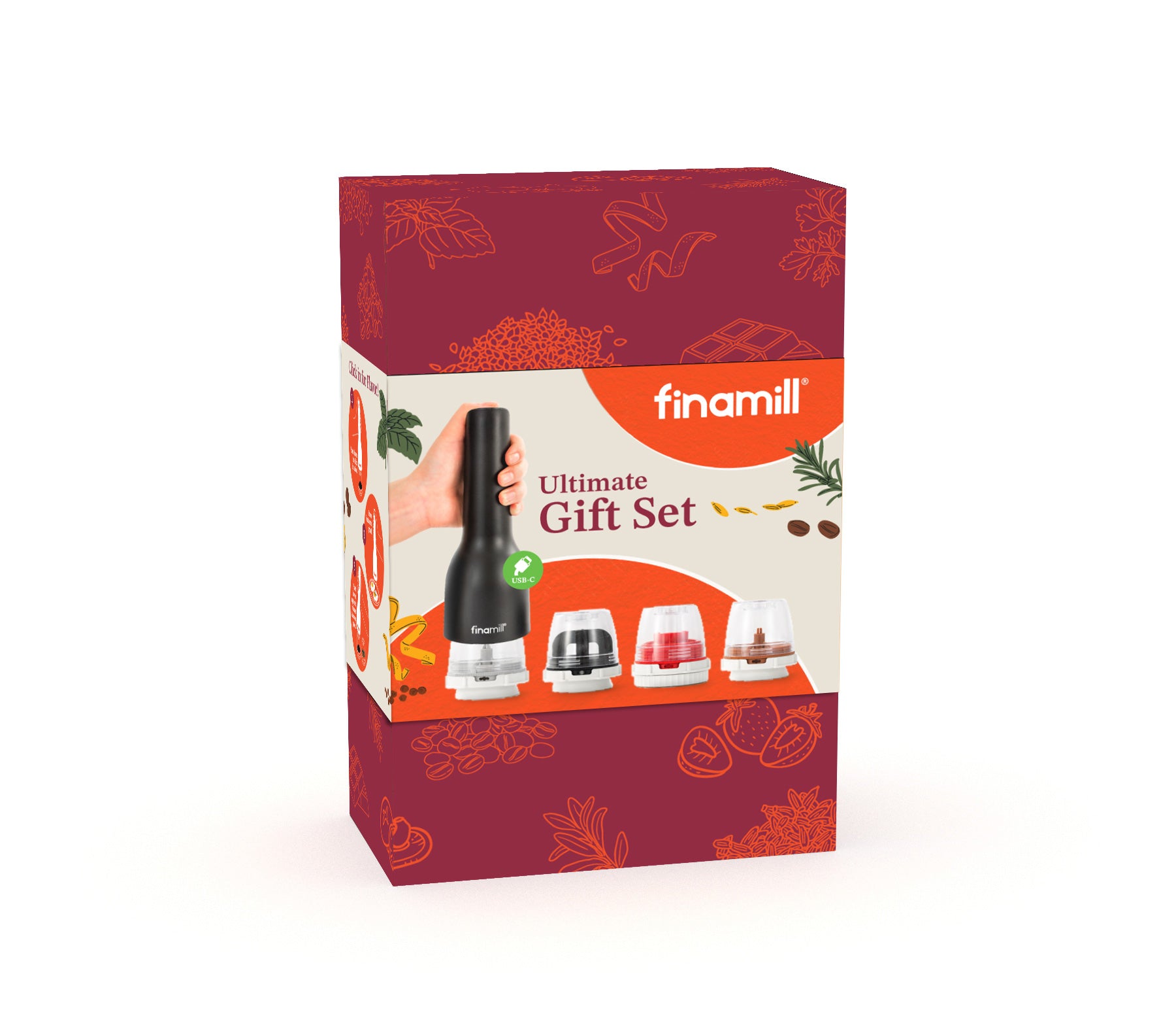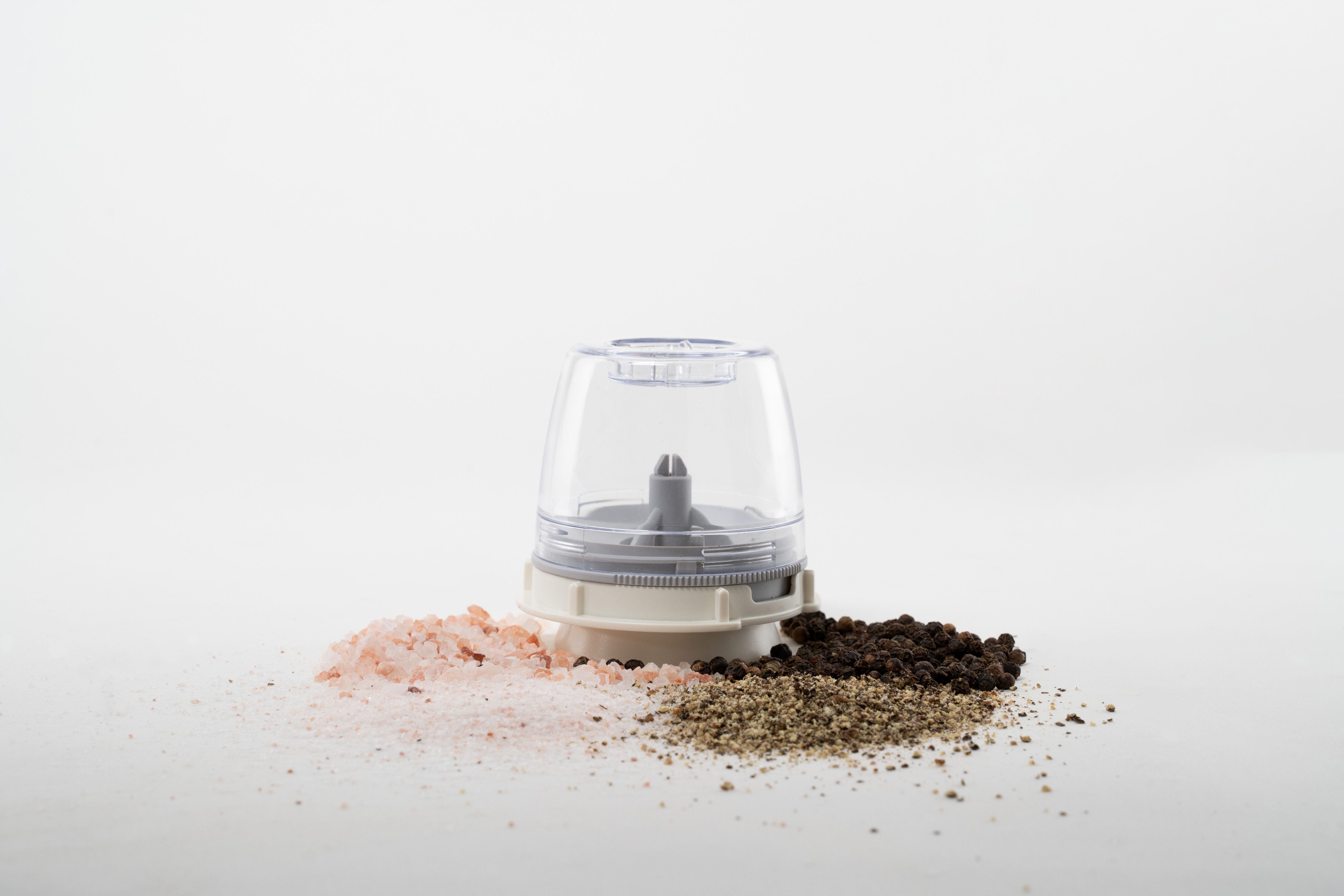 Finamill to elektryczny młynek do przypraw z wymiennymi kapsułami Finapods. Wystarczy włożyć kapsułę z przyprawą do bazy młynka i nacisnąć przycisk. Urządzenie automatycznie mieli przyprawy dzięki wbudowanemu mechanizmowi ceramicznemu.