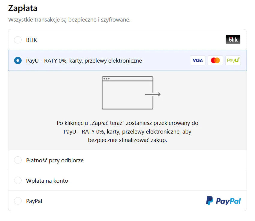 W kasie wybierz opcję "PayU - RATY 0%, karty, przelewy elektroniczne".
