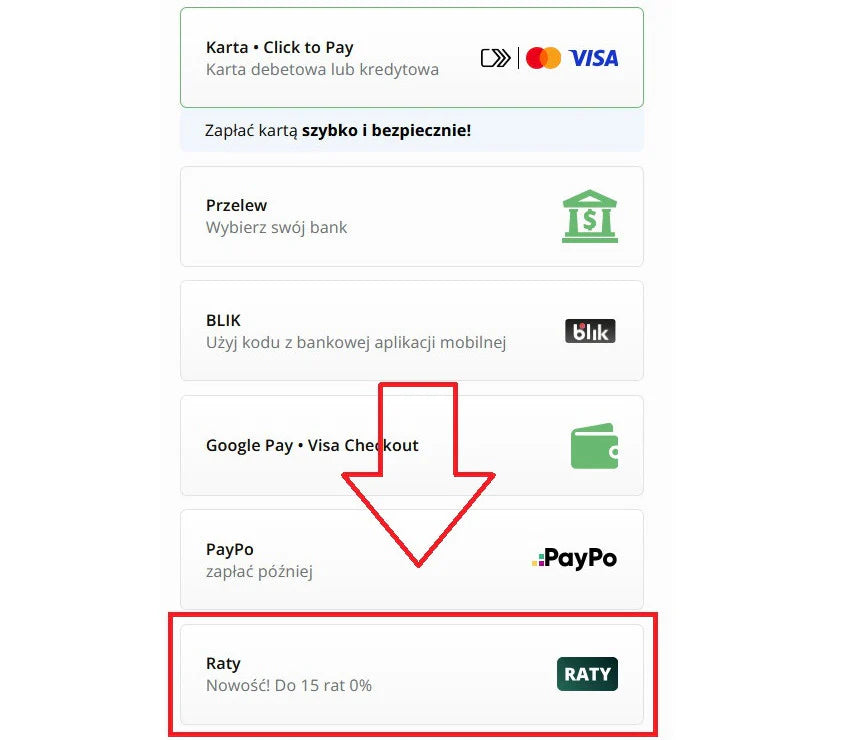 Na ekranie płatności wybierz ostatnią opcję - RATY.